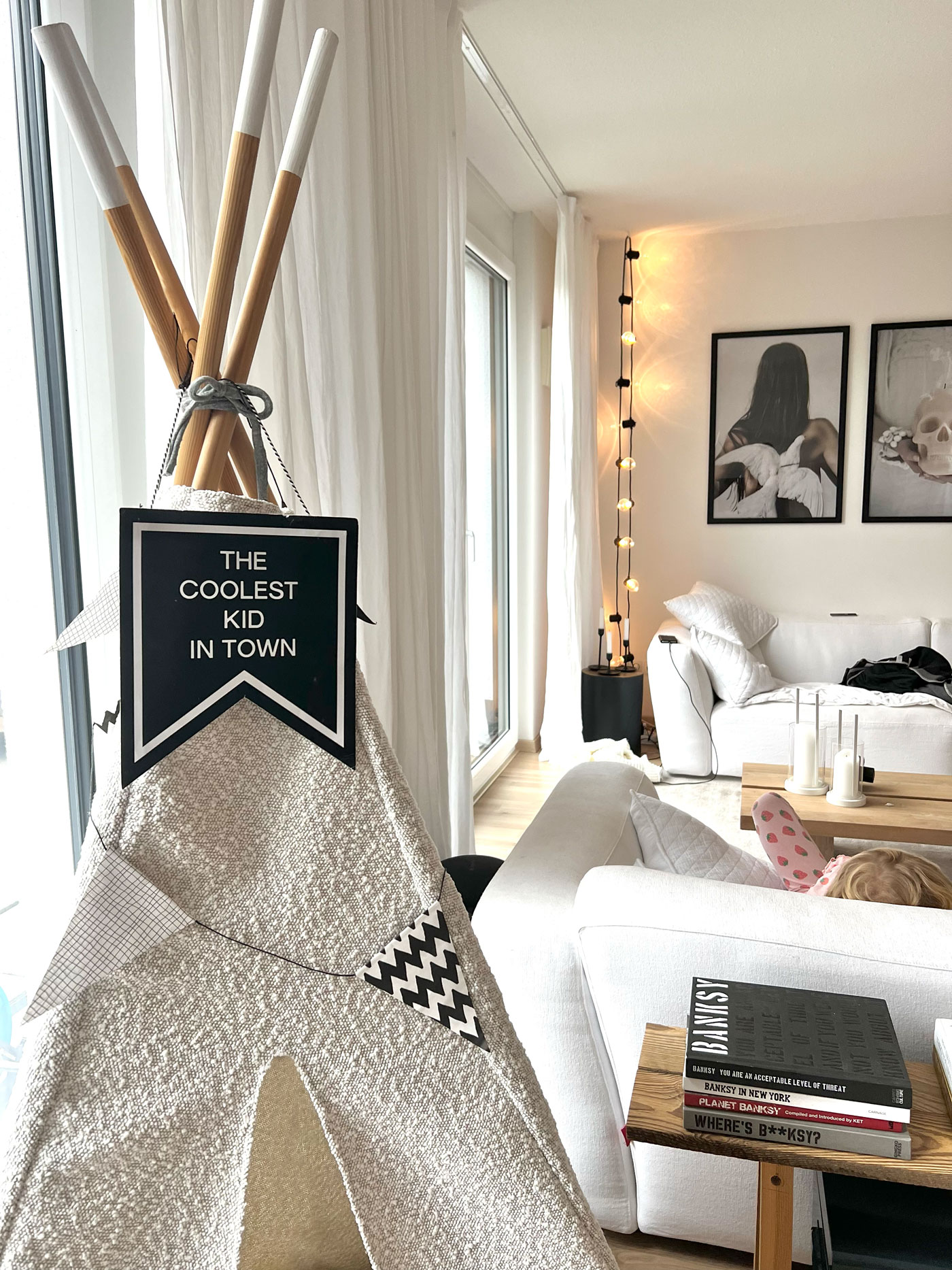Das Tipi wird in liebevoller Handarbeit aus hochwertigem Boucle-Stoff für Sie genäht. Zusätzlich gibt es eine Kordel zum fixieren der Stangen. Die Stangen kommen in Schlaufen, die innenliegend vernäht sind.