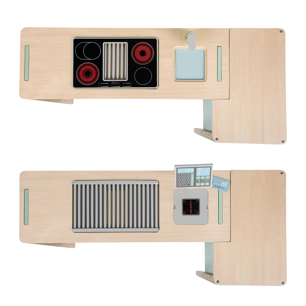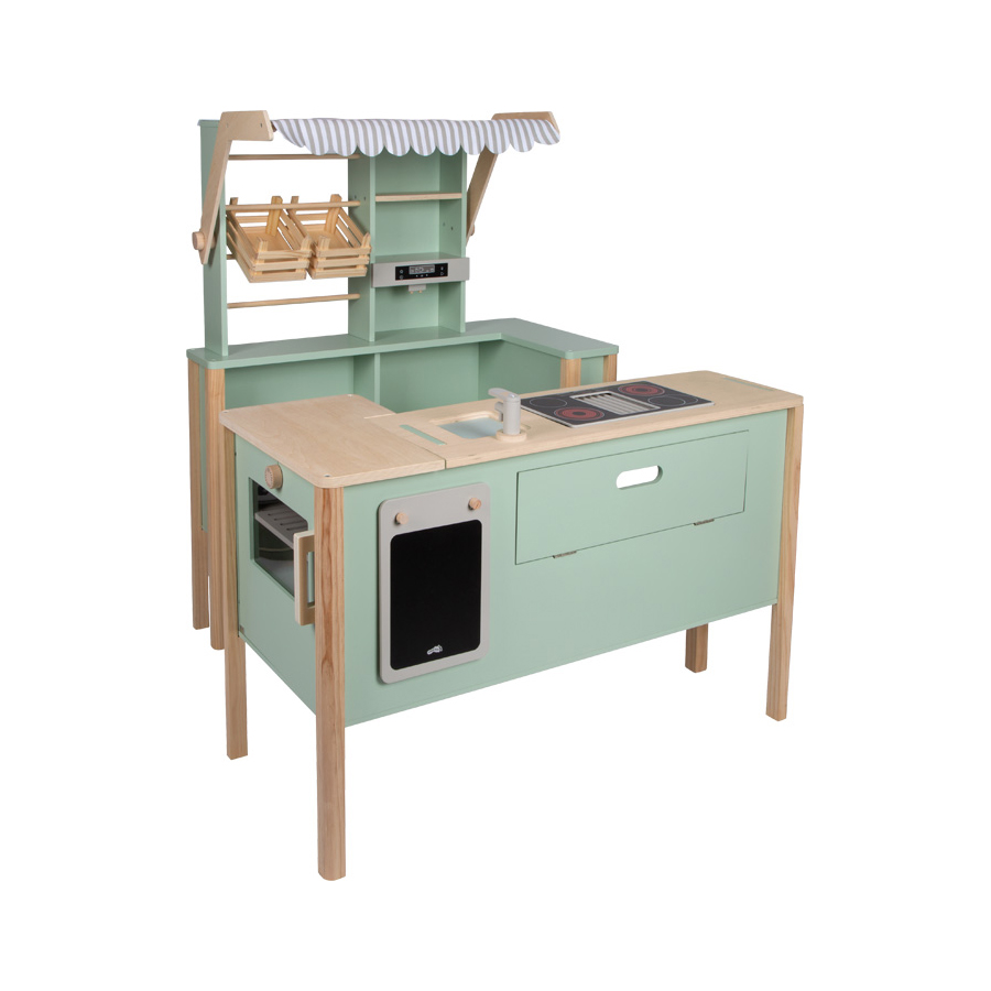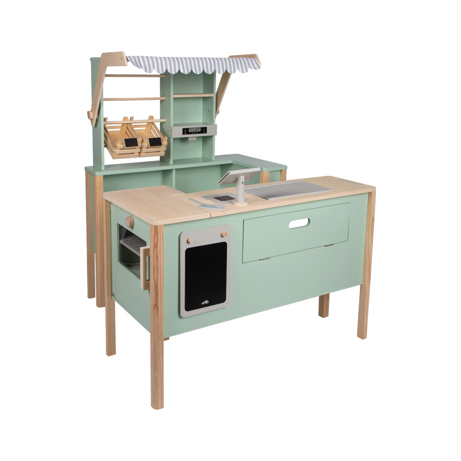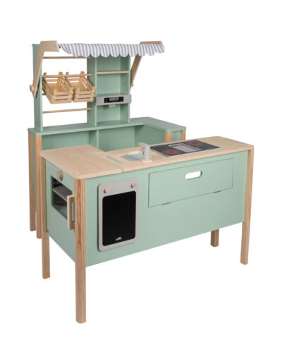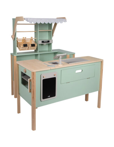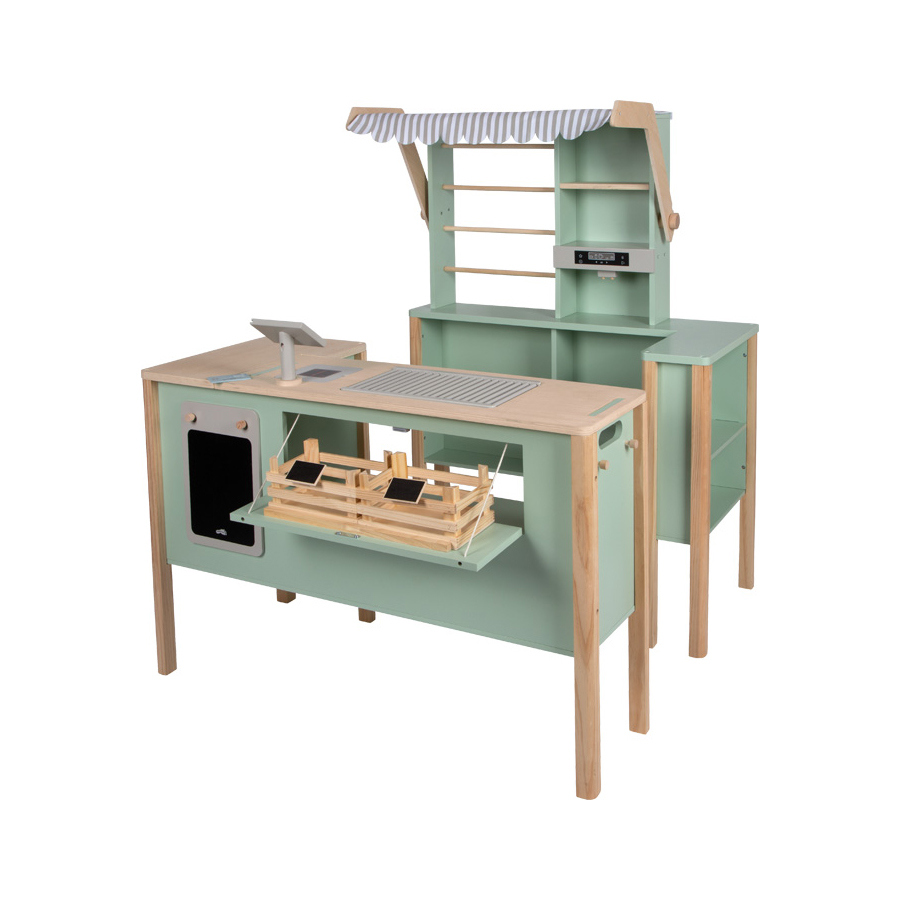 Kaufmannsladen, Kiosk & Imbiss, Marktstand, Küche oder Café? Dieser große, moderne Verkaufsstand mit abnehmbarem Bezug ist ein Multitalent, das im Nu seine Funktion wechseln kann. Flexible Module eröffnen unzählige Spielmöglichkeiten, je nach Platzangebot und Spielidee. Die Ausstattung mit Scanbereich inkl. Display und Kassenband, zwei Verkaufskörben mit Preisschildern, Angebotstafel, Wasserhahn, Kaffeemaschine, Spüle/Kasse, Grillbereich/Kochplatte/Kassenband und Backofen/Kühlschrank lässt keine Wünsche offen.