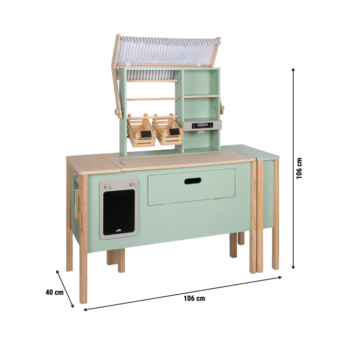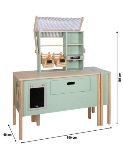 Maße: Tresen ca. 92 x 40 x 60 cm, Rückwand mit Markise ca. 81 x 40 x 106 cm, Kaufladen zusammengestellt ca. 106 x 40 x 106 cm.