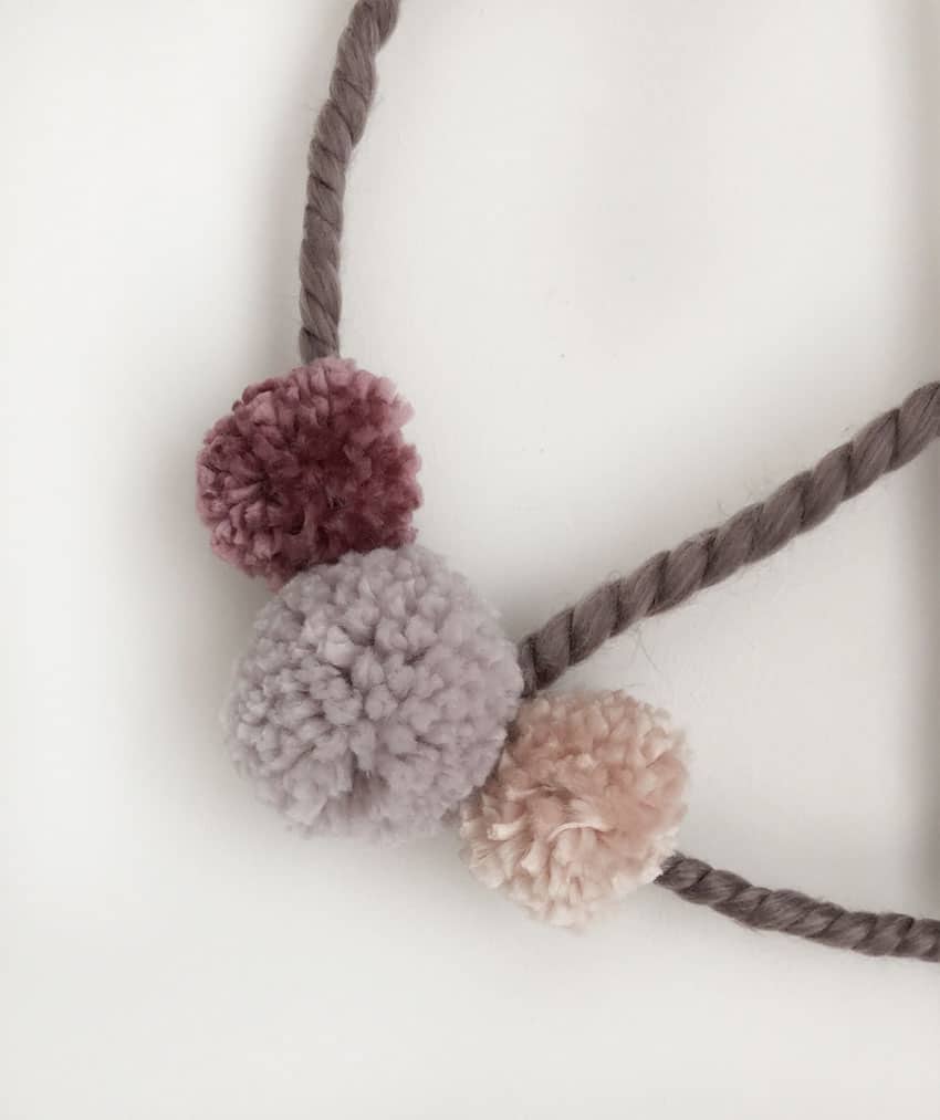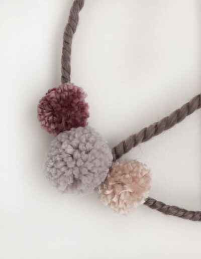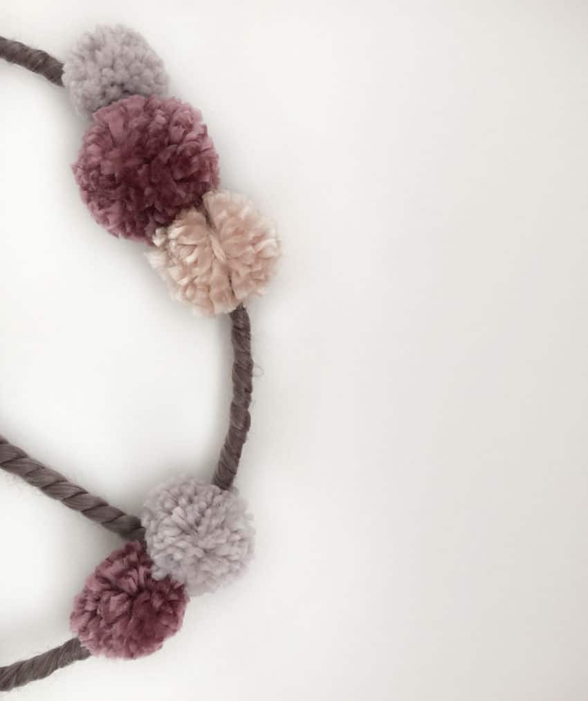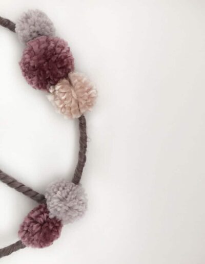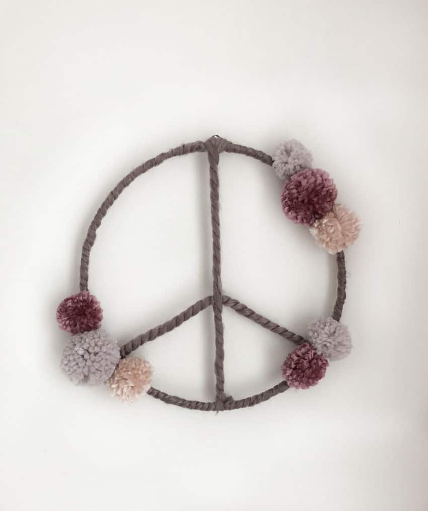 Unser Traumfänger wird in liebevoller Handarbeit aus hochwertigem Garn in der Farbe Altrosa gefertigt. Links befinden sich drei Bommel und rechts fünf Bommel, jeweils in den Farbtönen Rosa, Purple und Lila. In der Mitte ist ein Peace Zeichen.