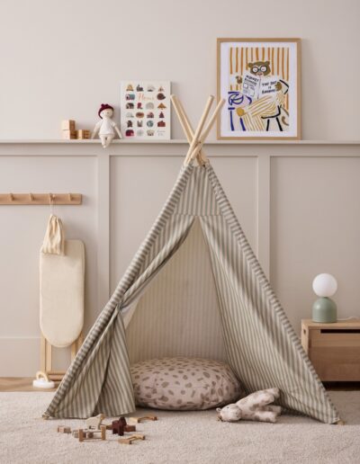 Das Tipi mit Streifen von Kids Concept ist der perfekte kleine Rückzugsort für Kinder – ein Ort zum Spielen, Kuscheln, Lesen oder Träumen. Mit seinem gestreiften Muster und der etwas kompakteren Größe passt es ideal ins Kinderzimmer oder Wohnzimmer, ohne zu viel Platz einzunehmen.