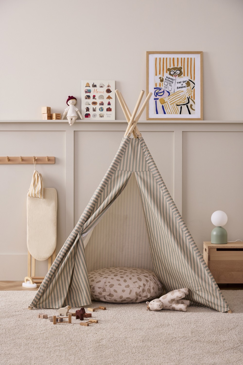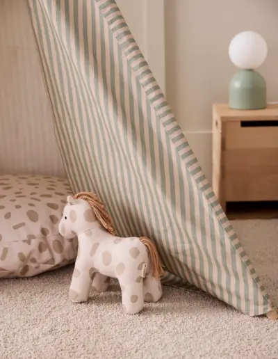 Hergestellt aus 100 % Baumwolle mit Zeltstangen aus Kiefernholz, überzeugt das Tipi durch natürliche Materialien, hohe Stabilität und liebevolles Design. Es schafft eine gemütliche Atmosphäre und regt Kinder zu kreativem Rollenspiel und Fantasieabenteuern an.