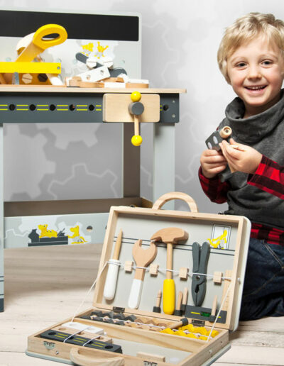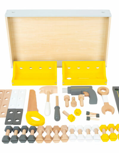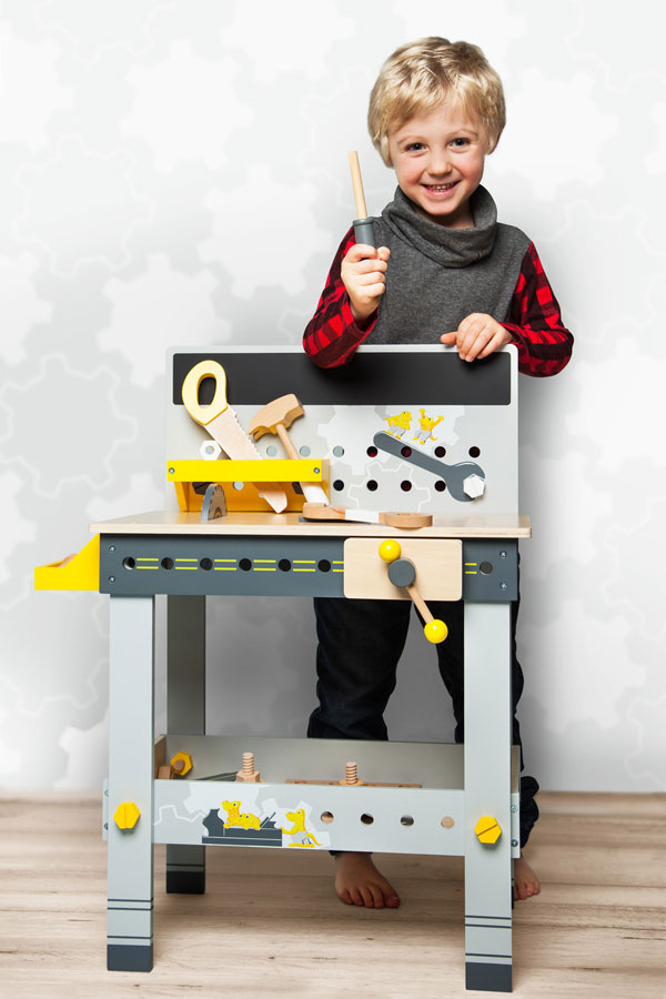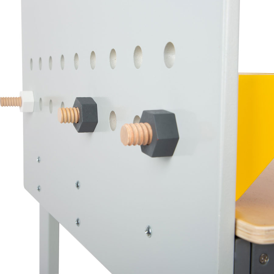 Sägen, schrauben, hämmern! Zusammen mit niedlichen Miniwobs werden mit dieser Werkbank aus Holz handwerkliches Geschick erprobt und feinmotorische Fähigkeiten geschult. Funktionale Besonderheiten sind die integrierte Kreissäge, die Wasserwaage und der Akkuschrauber mit drei auswechselbaren Bits. Auf der beschreibbaren Tafelfläche können die neusten Bauprojekte skizziert werden und je nachdem wo die modularen Aufbewahrungskästchen angeschraubt werden, fungieren sie als Werkzeughalter oder Stauraum. Besonderes Highlight: Kinder können schon beim Aufbau der Werkbank mitwirken! Inkl. 8 Werkzeugen und umfangreichem Zubehör. Dezente Illustrationen fleißiger Miniwobs regen die Phantasie und den Tatendrang der Kinder an und motivieren sie zum Tüfteln und Werkeln. Inkl. 8 Werkzeugen und umfangreichem Zubehör. Passt durch die intensive und dennoch reduzierte Farbgebung ideal zum Werkstattthema und fügt sich durch die klaren und reduzierten Farben gut in jeden Wohnraum ein. Das perfekte Rollenspielzeug für kleine Handwerker!