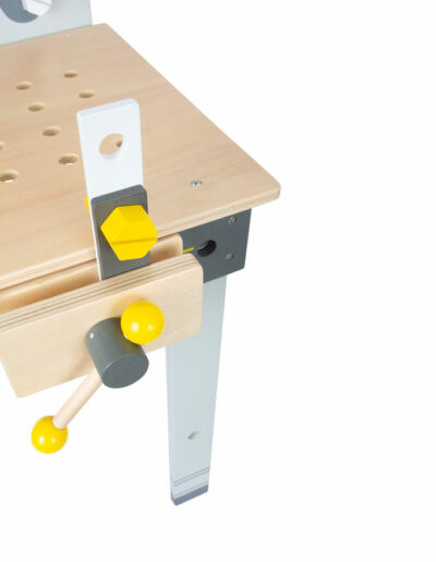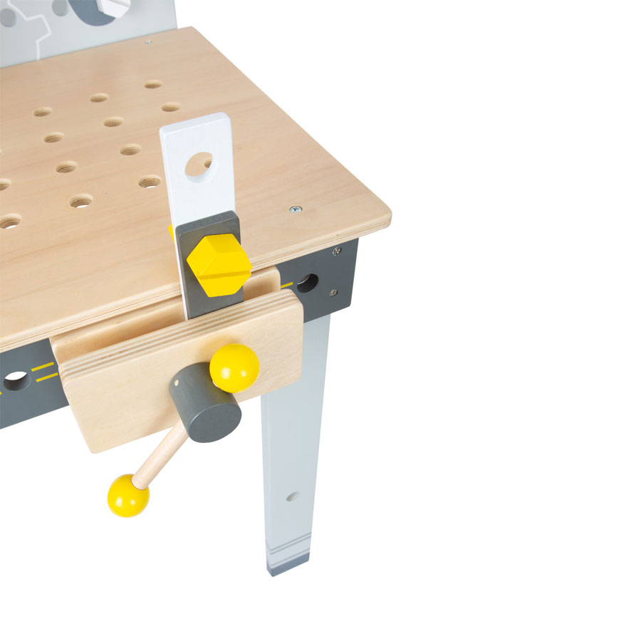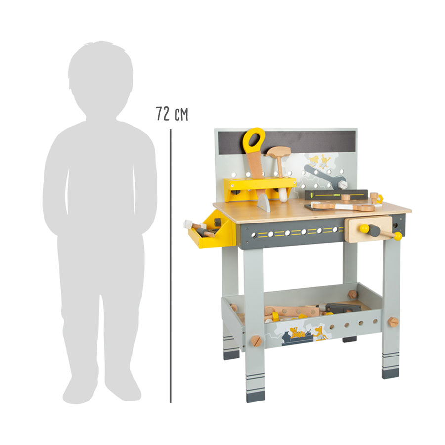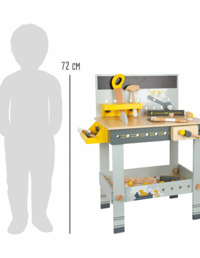 Maße ca. 50 x 41 x 72 cm, Arbeitshöhe ca. 50 cm. Werkzeug und Zubehör umfasst 1 Kreissäge, 1 Akkuschrauber mit 3 Bits, 1 Wasserwaage, 1 Schraubstock, 1 Hammer, 1 Schraubenschlüssel, 1 Schraubendreher, 1 Säge, 2 anschraubbare Kisten, 6 Konstruktionsleisten, 16 Schrauben, 16 Muttern, 3 Nägel.